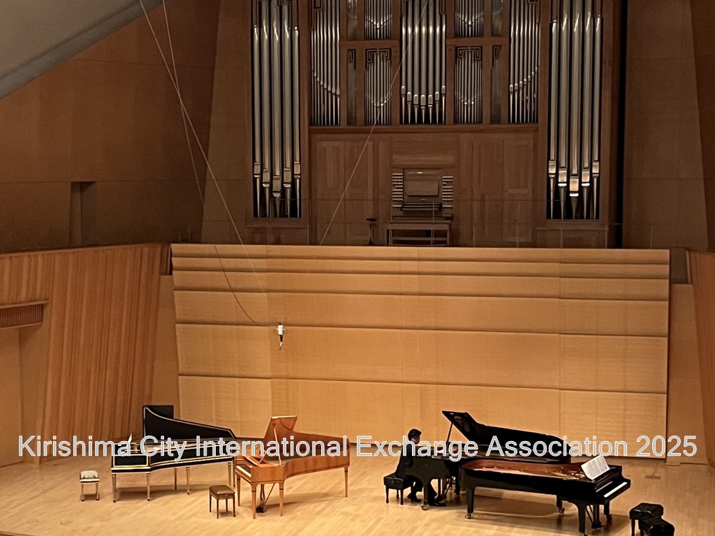 その後、みやまコンセールに移動し、「霧島芸術の森を巡る旅♪鍵盤楽器とパイプオルガンの調べ♪」の公演を鑑賞しました。公演は2部構成で、第1部ではチェンバロ、フォルテピアノ、グランドピアノの3種類のピアノ演奏が行われました。それぞれ使用されていた時代が異なることや、3種類揃っている会場は少ないということなど、音楽の知識も深めることができました。